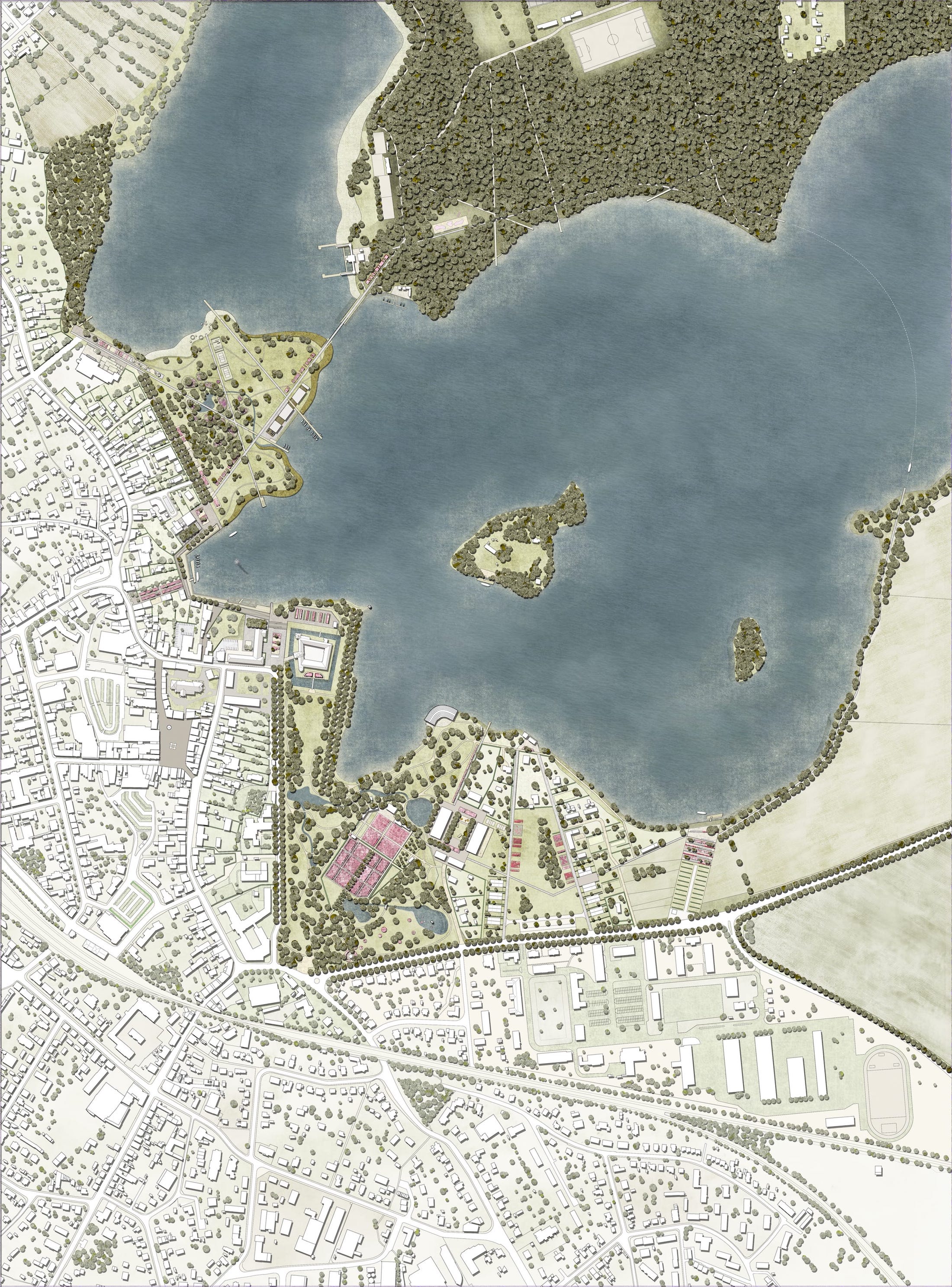 Eutin is a regionally significant residential and commercial locations. The old town and inner city, charac- terized by half-timber construction, classical buildings and the baroque moated castle, is situated bet- ween two picturesque lakes, the Großer Eutiner See and the Kleiner Eutiner See. The region’s positioning within the Holstein Switzerland Nature Reserve makes it a favorite tourist destination of northern inland Germany. Despite its prime locations, the unbuilt urban areas along the lakeshore, with the exception of the historic Schlossgarten (castle garden), offered little in terms of design or recreational quality. The water was given little or no priority; there was no network of paths and, more glaringly, no real sporting or recreational opportunities for families and young people. The landmark-protected Schlossgarten suf- fered from a disproportionately high demand for its use.