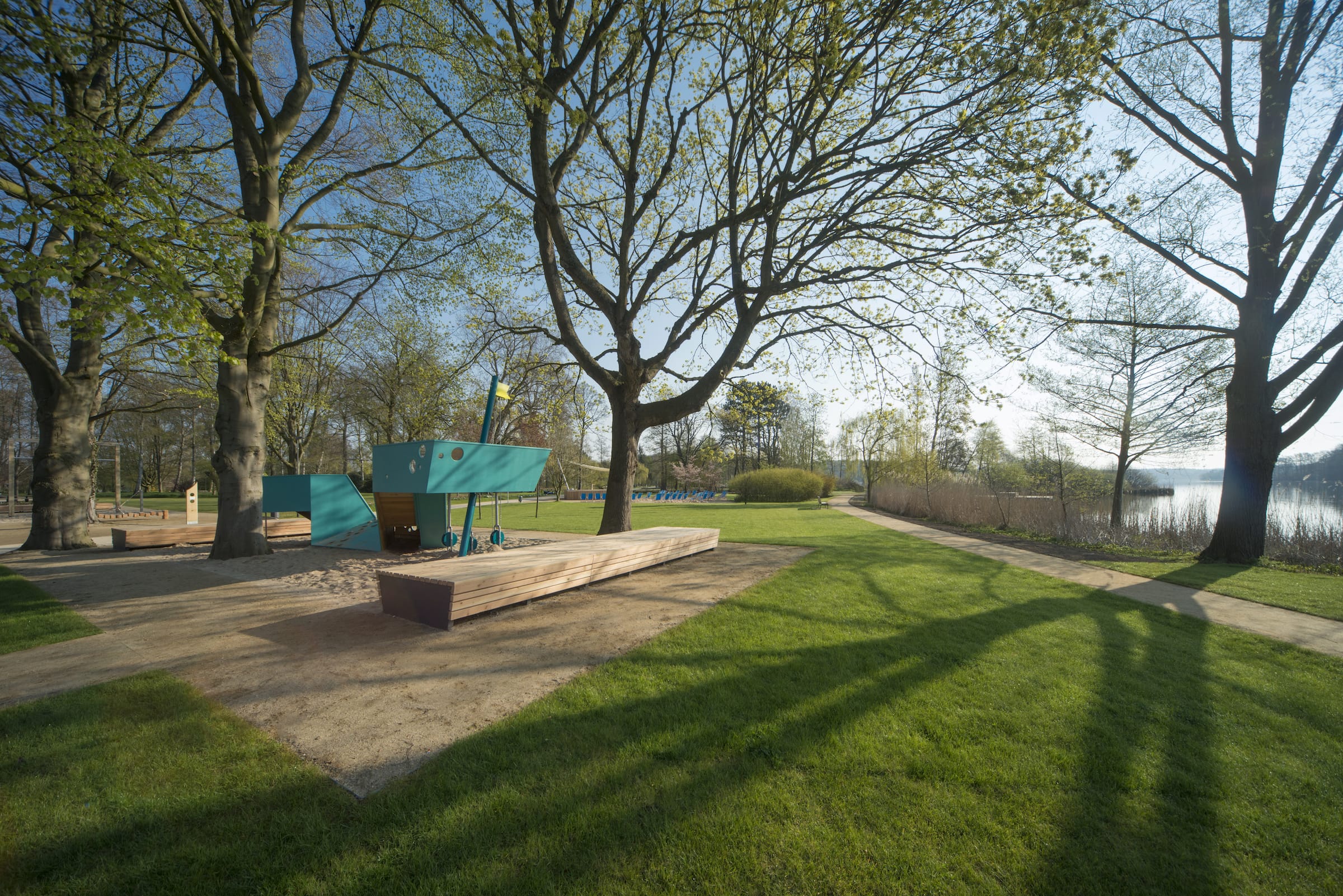 新的(de)公園軸線,參考曆史悠久的Lindenallee Schlossgarten,也起到了進入湖中的路徑(jìng)和視覺軸線(xiàn)的作用,比如(rú)木製碼頭,在它們的末端加寬以(yǐ)形成座位平台,並直接在水上創造吸引人的新娛樂機會,從這裏可以(yǐ)看(kàn)到(dào)湖泊、體育場和(hé)城(chéng)堡(bǎo),這裏(lǐ)的水(shuǐ)現在是公園不可分割的一部分。另外一個方麵是有選擇地進入湖岸(àn),這有助於保護周圍的海岸地區和蘆(lú)葦種群。雖然進行了大量的清理工作(zuò)來創建公園軸線、視線和廣闊的休閑草地,但公(gōng)園北部沿(yán)岸的榿木沼澤森林也得到了生態修(xiū)複。