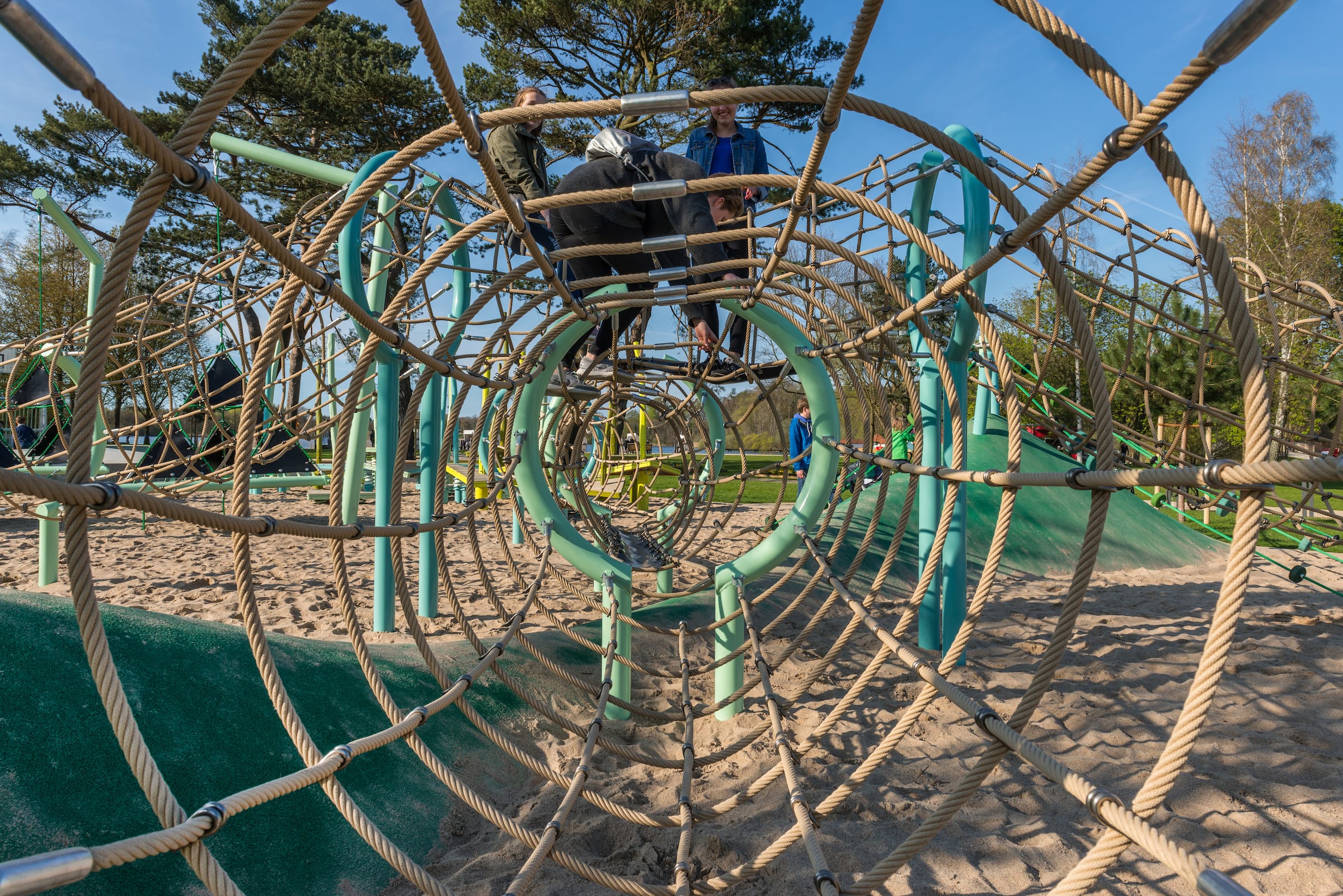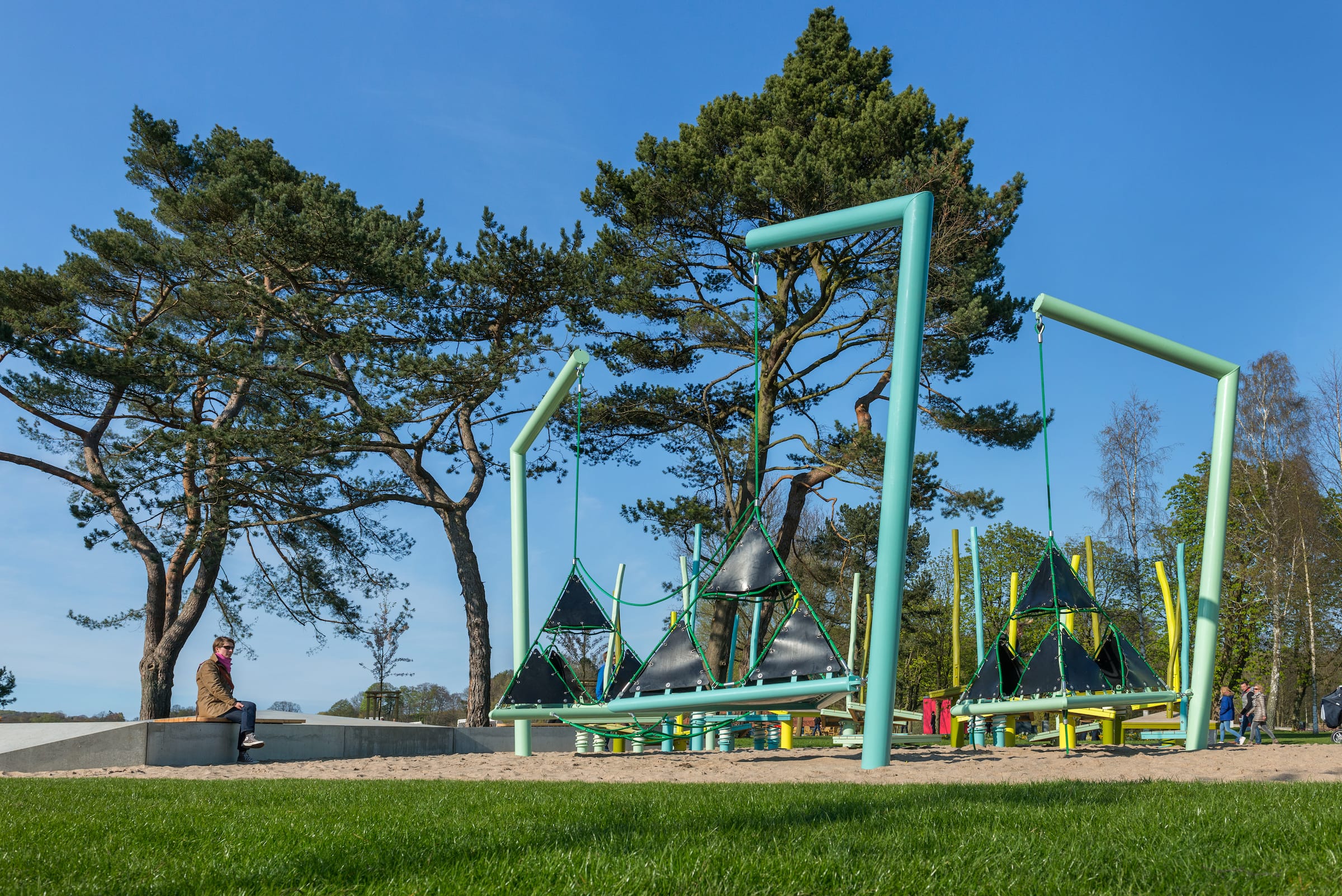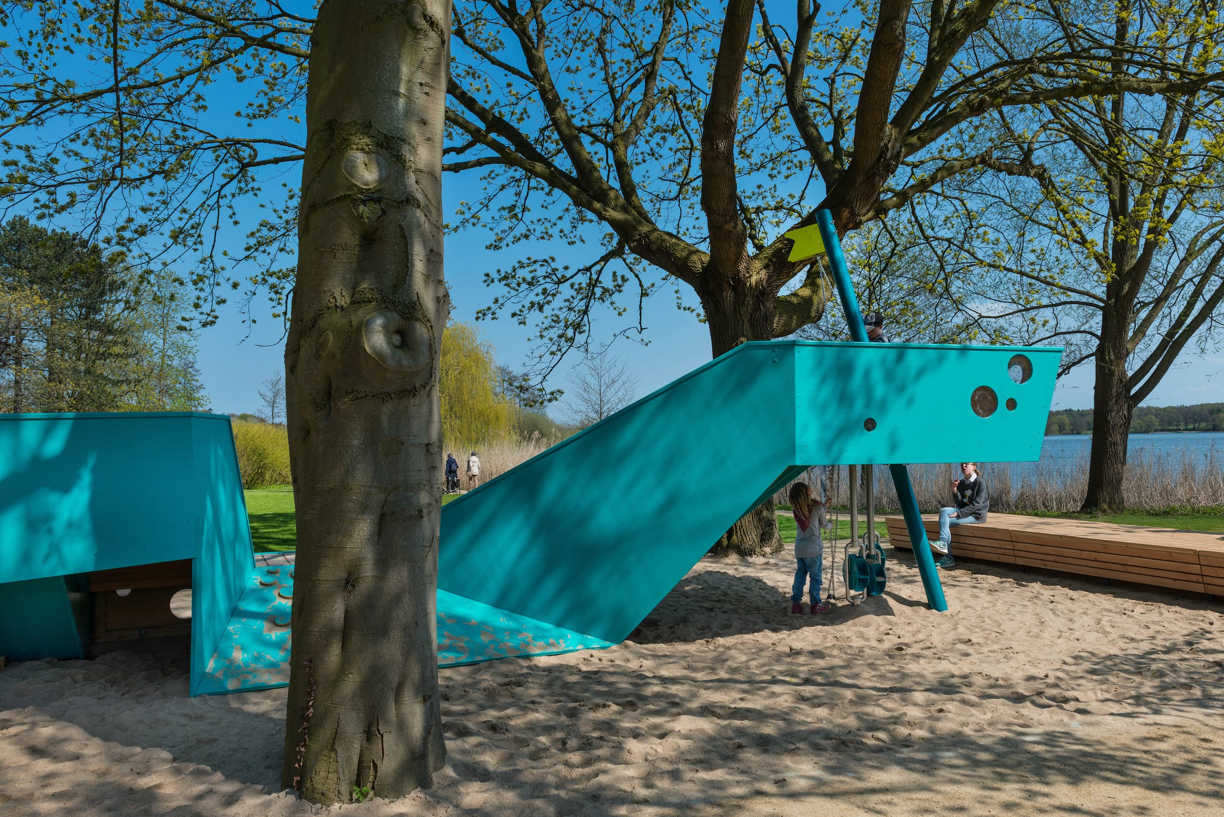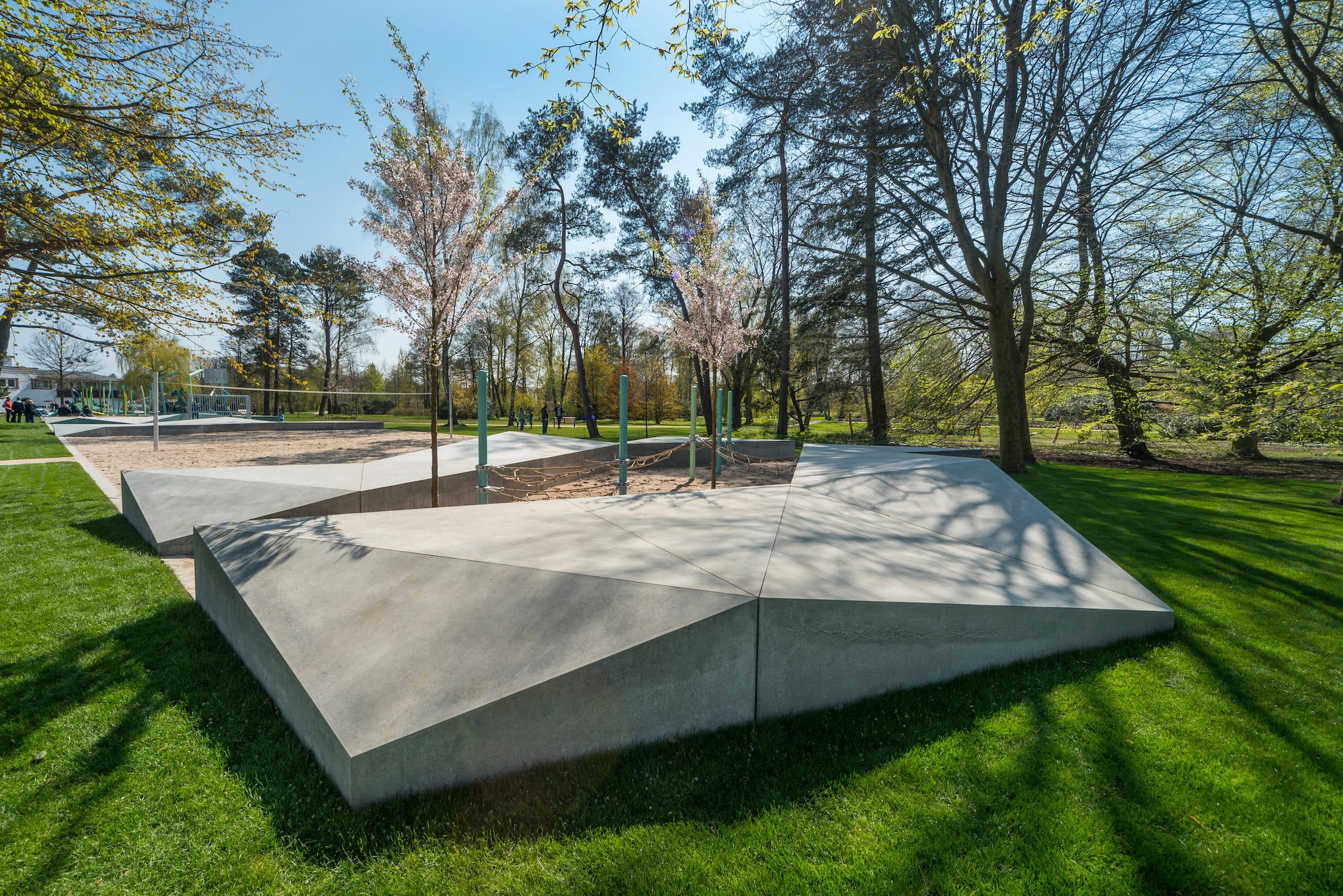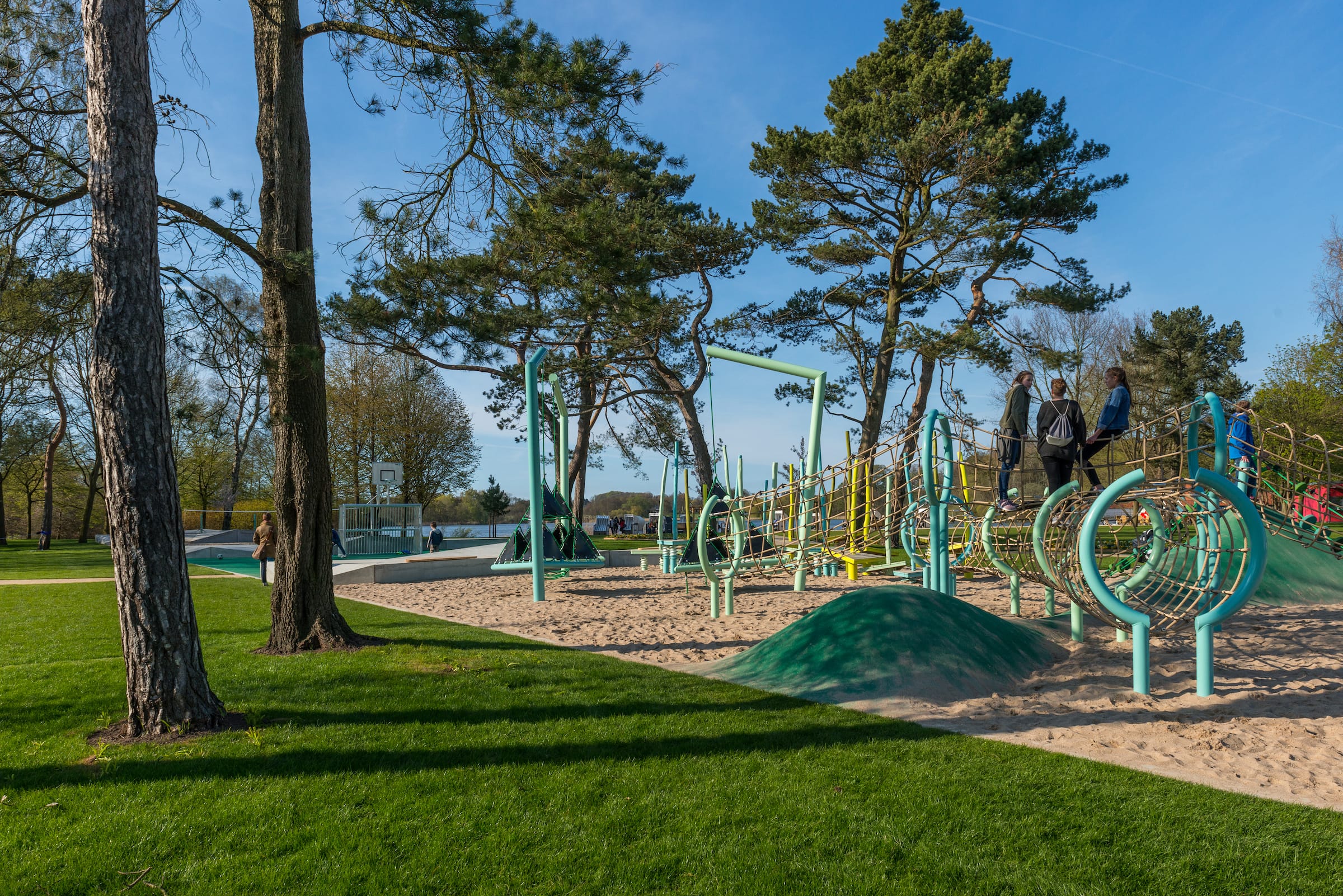 作為與曆史悠久的Schlossgarten公園形成對比的一個景觀,Seepark已(yǐ)發展成為一個娛樂性的景觀,為家庭、兒童和青少年提供了各(gè)種各樣的活動空間,緩解了以前對地標保護花園的過度使(shǐ)用。除了開闊的放鬆區域,它還提供了許多戶外活動機(jī)會,為兒童(tóng)和(hé)青少年舉辦講習班,設計他們自己的遊戲和運動場地。沙(shā)灘上有日(rì)光浴區,也(yě)有沙灘排球和街球(qiú)的場地。“湖泊”和“森林”的主題(tí)是在一個多層(céng)麵的、挑戰性的麵向兒童的(de)遊戲世界中(zhōng)體現的(de),這為他們的感官而打造:攀爬(pá)可以測試他們的平衡和靈活性;網狀隧道像魚(yú)網一樣伸展(zhǎn),覆蓋在模型(xíng)塑料表麵;帶(dài)有擋泥板的鬆緊(jǐn)繩索也(yě)可以(yǐ)攀(pān)爬;移動的柱子創造了一個“搖(yáo)擺的森林”;樹屋正在建造中。整(zhěng)個公園都有野餐和燒烤的地方。