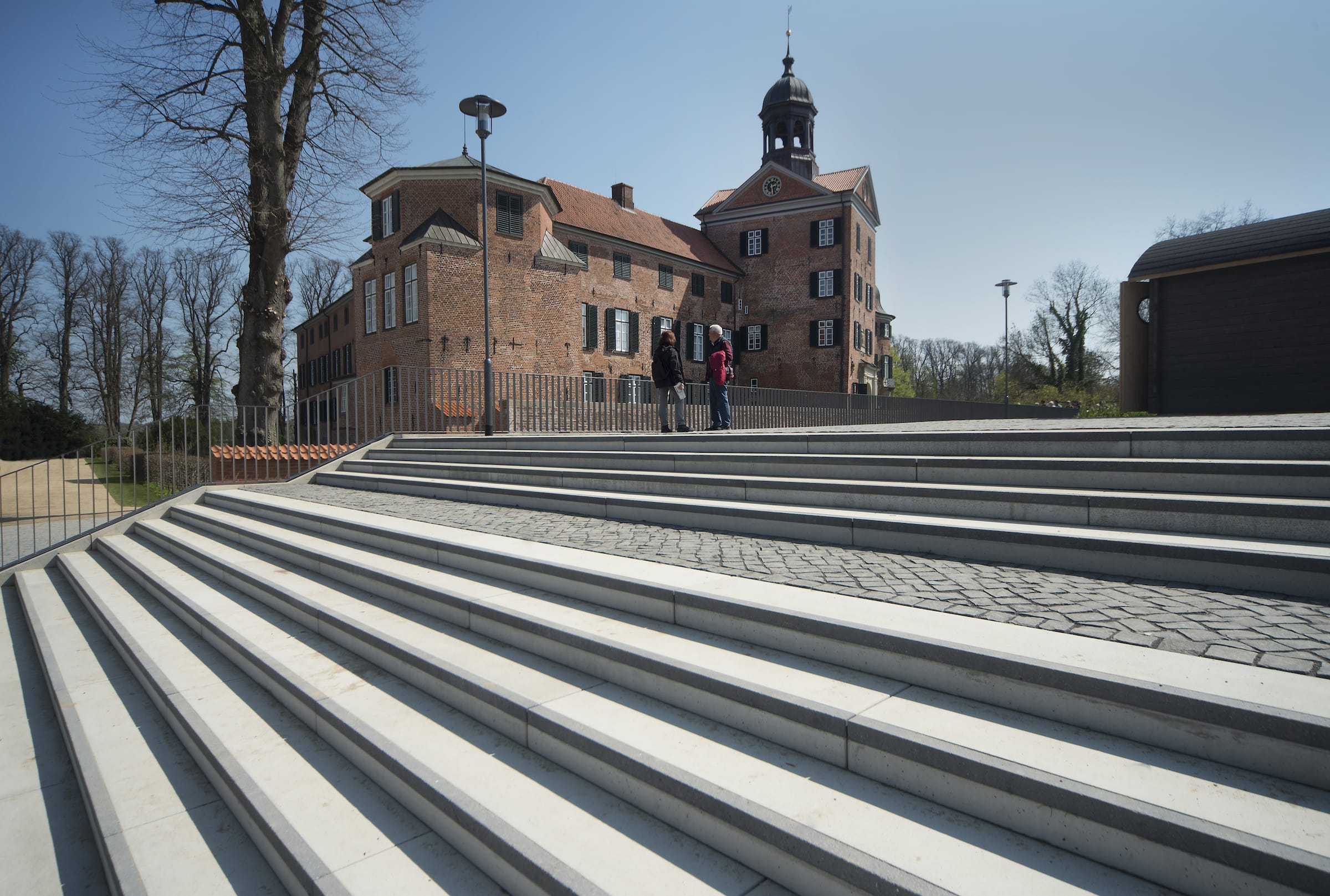 Eutin’s historic building yard has been one of the city’s significant cultural locationss. Both the Opern- scheune (opera barn) and the outdoor stage situated directly by the lake serve as venues for the city’s annual opera festival. The construction of a youth hostel has given the grounds a practical function all year long. The two historic gatehouses together with the cubature of the youth hostel create a three-sided forecourt – framed by rose beds and benches under old trees – with a view over the lake. The design of the square combines the buildings into a picturesque ensemble while the roses embrace Eutin’s gardening tradition. The grounds create new path linkages west to the Schlossgarten and east to the new Southshore Park, which can be reached over meadows traversed by the reopened Lindenbruch- graben (lime-tree ditch). The development of single-family homes is planned for the medium term. The unobtrusively designed landscape of meadows, including a playground, remains as a new, local, publicly accessible recreational area, which creates an urban development framework while offering attractive surroundings for the planned development.